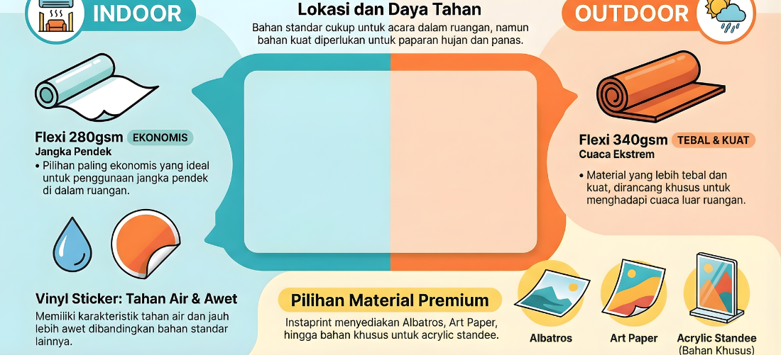 Kalau untuk event sehari di dalam ruangan, bahan standar sudah cukup. Tapi kalau dipasang di luar dan kena hujan panas, tentu perlu bahan yang lebih kuat. Instaprint menyediakan berbagai pilihan bahan seperti flexi, albatros, art paper, art carton, vinyl, hingga bahan premium untuk acrylic standee dll.