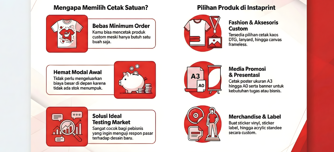 Cetak satuan itu artinya kamu bisa produksi tanpa minimum order besar. Mau cetak 1 kaos, 1 poster, 1 stiker pun tetap bisa jalan.