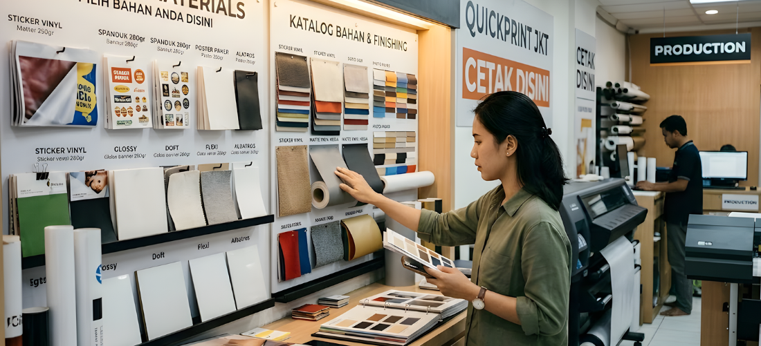 Pemilihan bahan harus menyesuaikan fungsi dan lokasi pemakaian. Untuk luar ruangan, flexi 340gsm lebih tahan angin dan cuaca. Untuk label produk minuman, sticker vinyl atau transparan lebih awet. Untuk tampilan premium seperti display mall atau booth event, acrylic memberikan kesan elegan dan profesional.