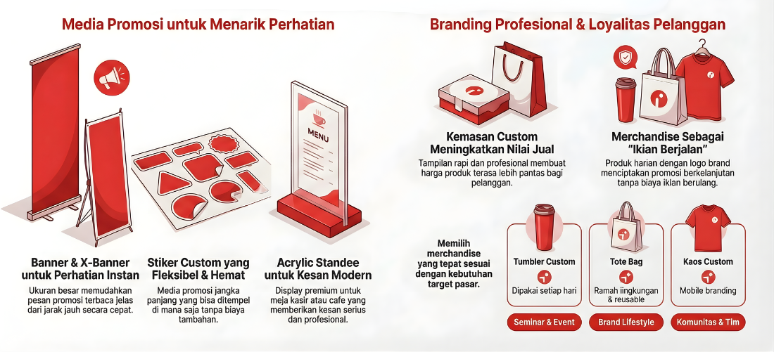 Produk digital printing yang paling efektif untuk promosi adalah yang terlihat jelas, sering digunakan, dan bisa dicustom sesuai identitas brand. Seperti sticker, banner, merchandise, kemasan custom, dan display acrylic jadi pilihan paling kuat untuk menaikkan awareness sekaligus penjualan.