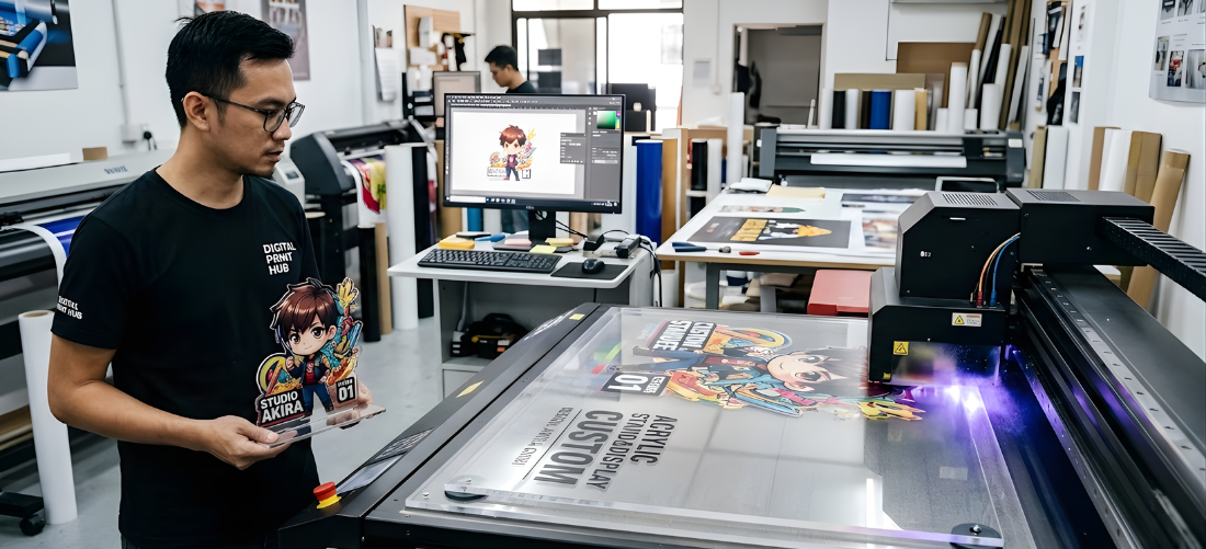 Di digital printing tangerang Instaprint, acrylic standee dicetak dengan UV print langsung ke media acrylic.