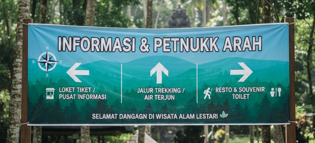 Percaya atau tidak, banner yang jelas bisa mengurangi setengah dari pertanyaan pengunjung seperti: "Mas, pintu keluar di mana?", "Kak, toilet sebelah mana ya?", "Ini kolam arus atau kolam anak?"