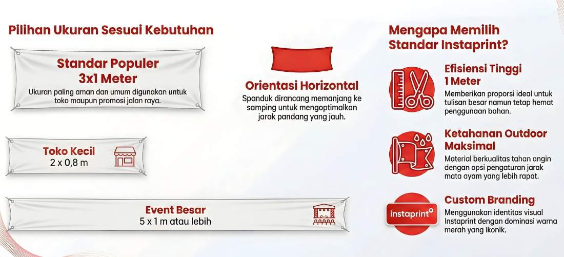 Ukuran standar banner biasanya mulai dari 60x160 cm sampai 4x2 meter. Poster mengikuti seri A (A4 sampai A0). Spanduk umumnya 2x1 meter sampai 5x1 meter. Semua bisa dicustom di Instaprint sesuai kebutuhan lokasi dan target audiens.